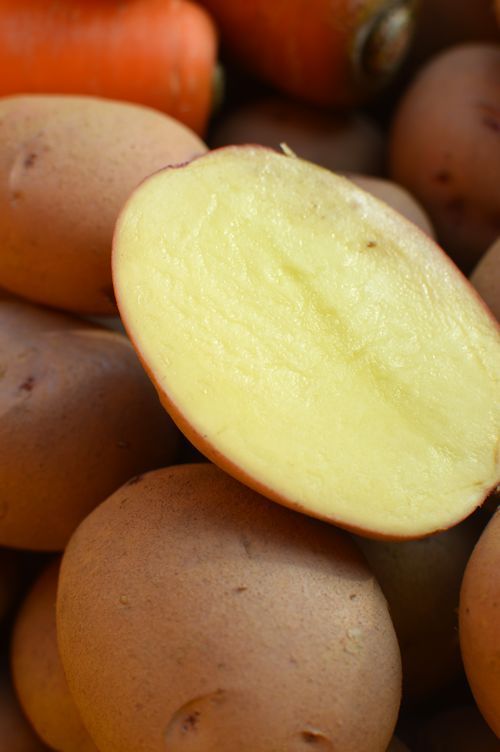 横田さん自慢の品種「アイノアカ」は、ほんのり紅色のなめらかな皮で果肉はクリーム色。ジューシーでクセのない味わいは料理を選ばず広く愛されるじゃがいも。